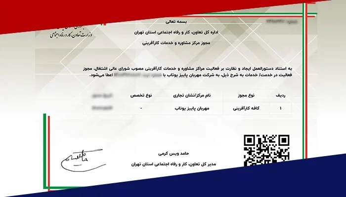 این وبسایت دارای مجوز فعالیت کافه کارآفرینی به شماره ۴۴۶۰۳۴۷ است که توسط اداره کل تعاون، کار و رفاه اجتماعی استان تهران و بر اساس آییننامه ایجاد و نظارت بر مراکز مشاوره و خدمات کارآفرینی مصوب شورای عالی اشتغال صادر شده است.
