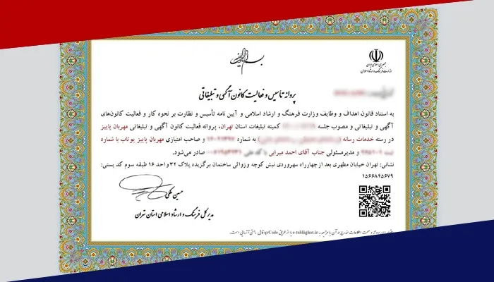 دکتر احمد میرابی ( مدیرعامل شرکت مهربان پاییز یوتاب ) دارای مجوز رسمی کانون آگهی و تبلیغات از وزارت ارشاد است؛ مجوزی معتبر که نشاندهنده صلاحیت حرفهای، آشنایی با قوانین تبلیغات، رعایت استانداردهای اخلاقی و تخصص در طراحی و اجرای کمپینهای تبلیغاتی است.